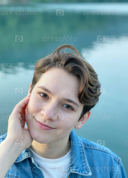 Портрет юной женщины, улыбающейся на открытом воздухе возле поверхности озера