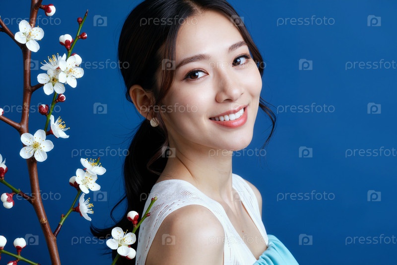 Портрет молодой азиатской женщины, улыбающейся рядом с цветущей ветвью