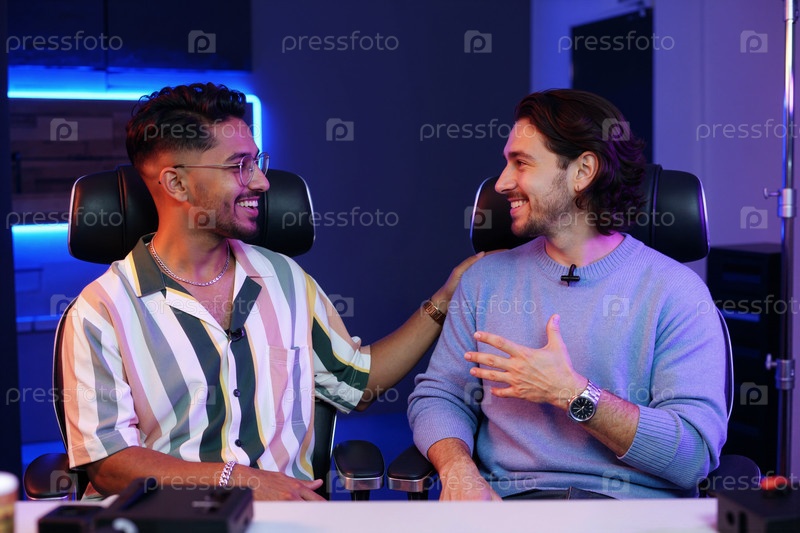 Два молодых человека улыбаются и разговаривают, сидя в современной студии