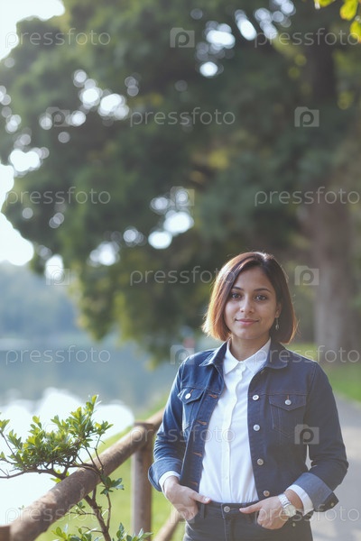 Портрет молодой испаноязычной женщины, стоящей на открытом воздухе возле зеленых деревьев