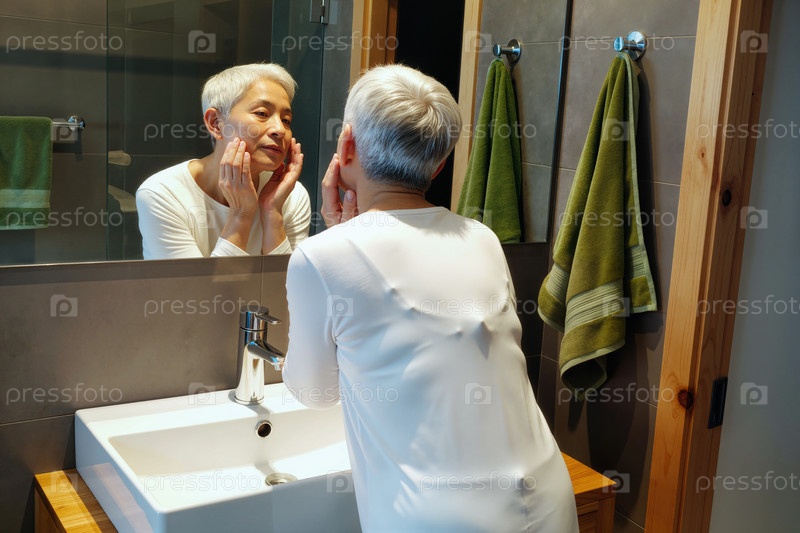 Старшая женщина, осматривающая лицо в зеркале ванной комнаты во время утренней рутины