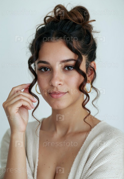Портрет молодой женщины, улыбающейся и касающейся кудрявых волос