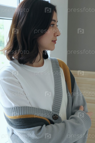 Молодая азиатская женщина стоит в помещении и смотрит из окна, отражая отражение