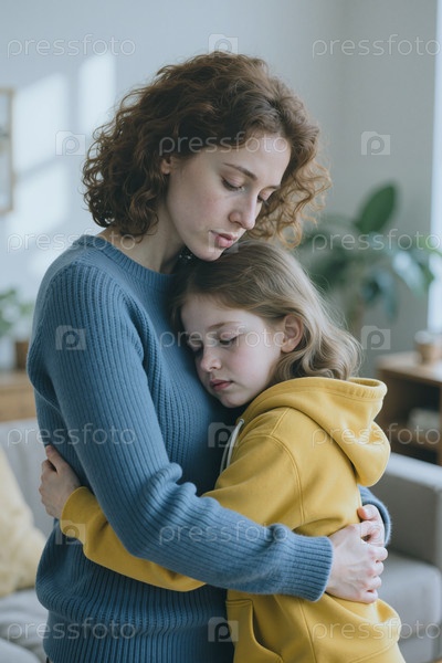 Взрослая женщина утешает ребенка дочь дома для поддержки семьи