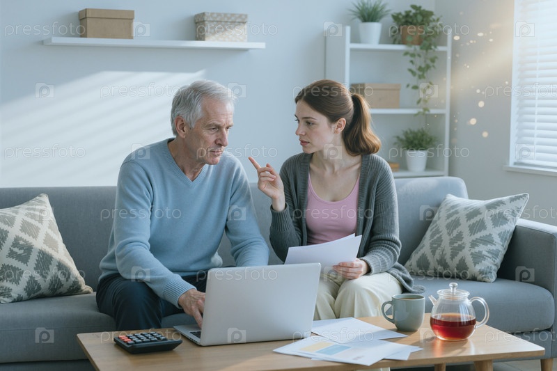 Старший мужчина и взрослая женщина просматривают финансы на ноутбуке дома