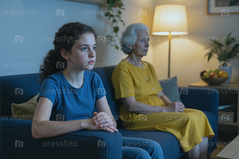 Подростковая девушка со старшей женщиной смотрит телевизор дома