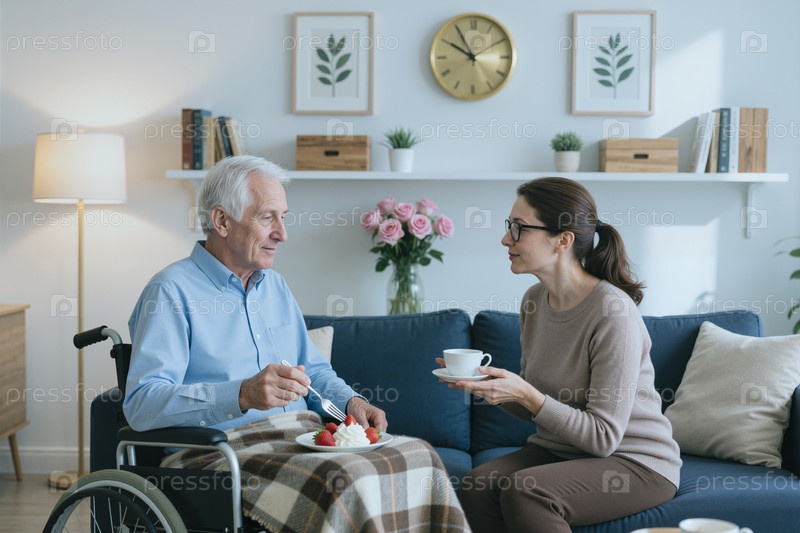Мужчина с инвалидностью, получающий поддержку по уходу на дому от старшей женщины