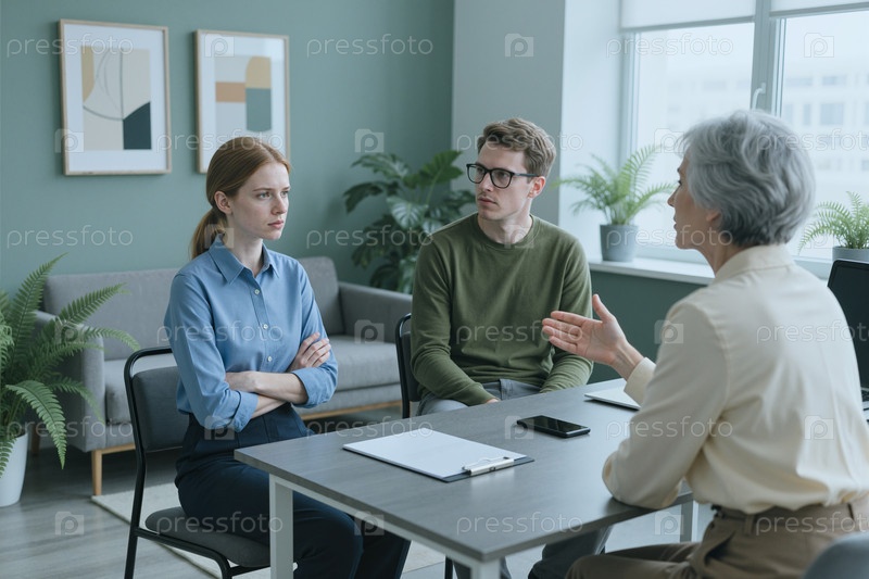 Женщина-взрослый консультирует взрослую пару во время сеанса терапии