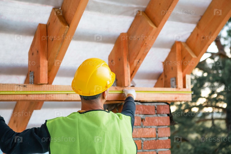 Мастер-строитель укрепляет потолочную древесину во время сборки задержки на крыше, тщательное расположение рук, домашнее строительство и плотничьи знания