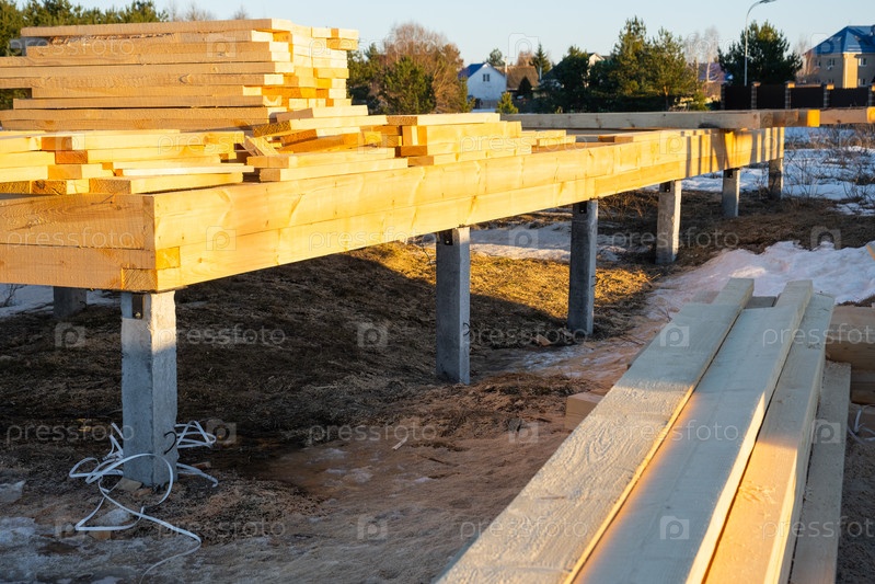 Шрубовый фундамент для деревянного каркасного дома, основание для установки, строительная площадка, первый этап здания, земляные работы, монтаж древесных балки
