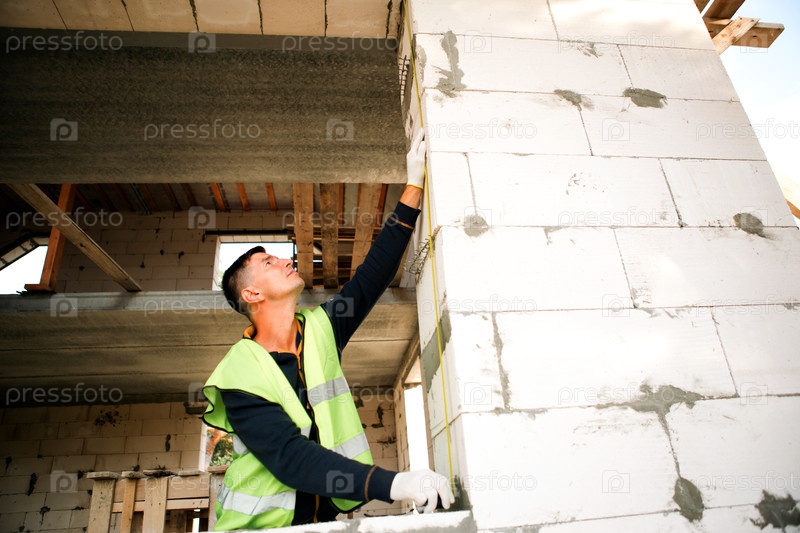 Строительный работник проверяет высоту потолка, измеряет перегородку, планирование проекта, задачу установки, меры безопасности, улучшение, последовательность ремонта здания