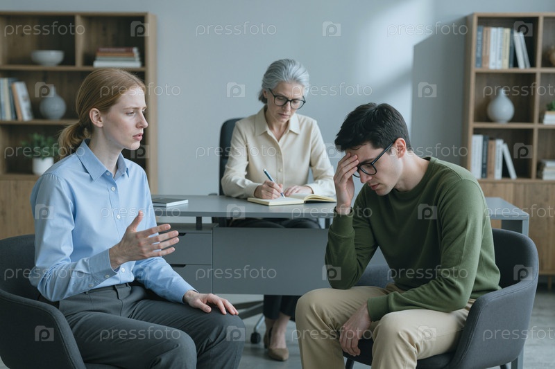 Женщина консультирует стрессового мужчину во время сеанса терапии взрослых