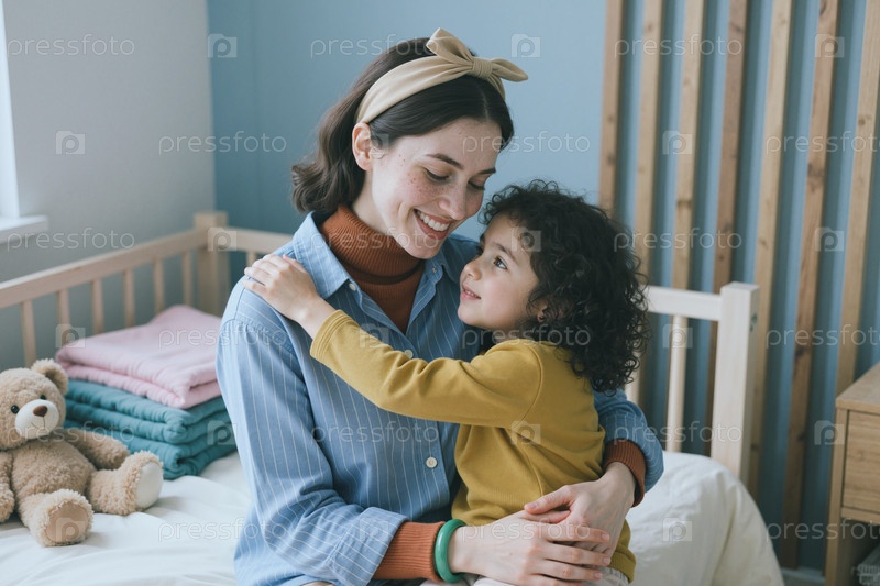 Взрослая мать обнимает маленькую дочь в детском саду для семейного ухода