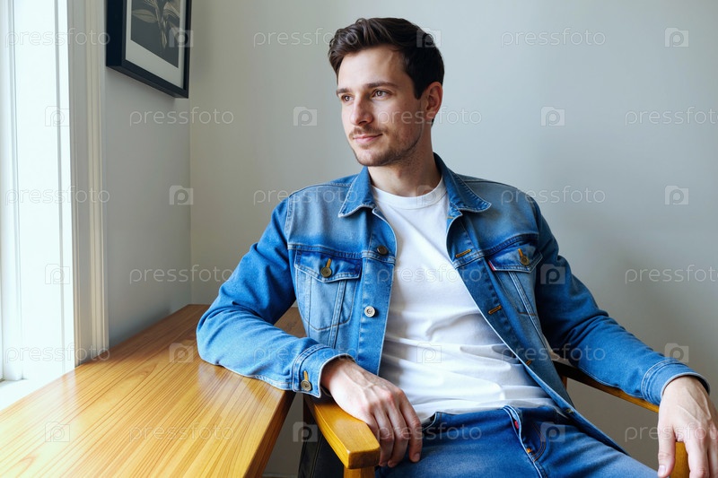 Взрослый мужчина сидит у окна и смотрит в сторону с задумчивым настроением