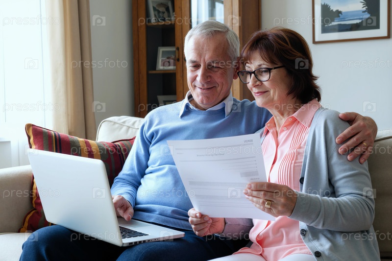 Старшая пара просматривает финансовые документы и ноутбук дома