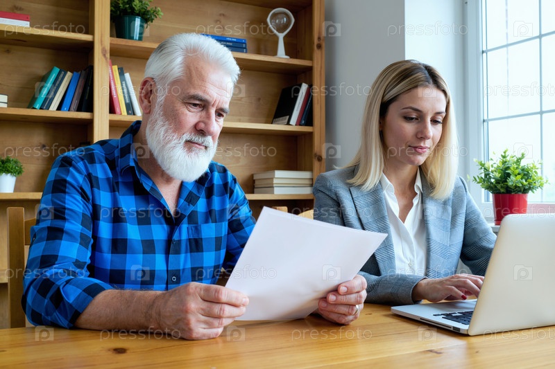 Старший мужчина просматривает документы с женщиной, использующей ноутбук дома