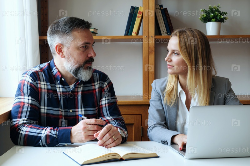 Взрослый мужчина и взрослая женщина обсуждают проект в офисе