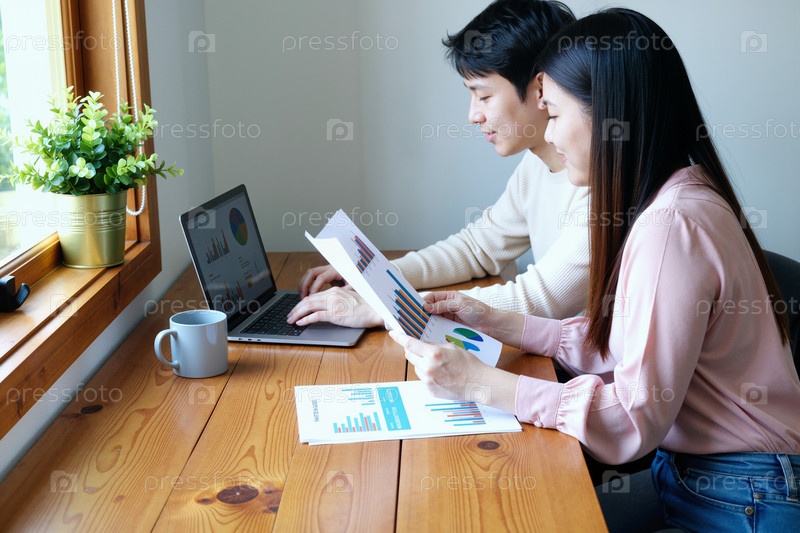 Мужчина и женщина просматривают азиатские отчеты о продажах на ноутбуке в офисе