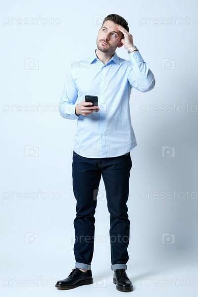 Взрослый мужчина держит смартфон и думает о бизнес-решении