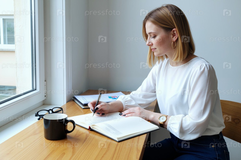 Взрослая женщина пишет заметки по окну для планирования удаленной работы