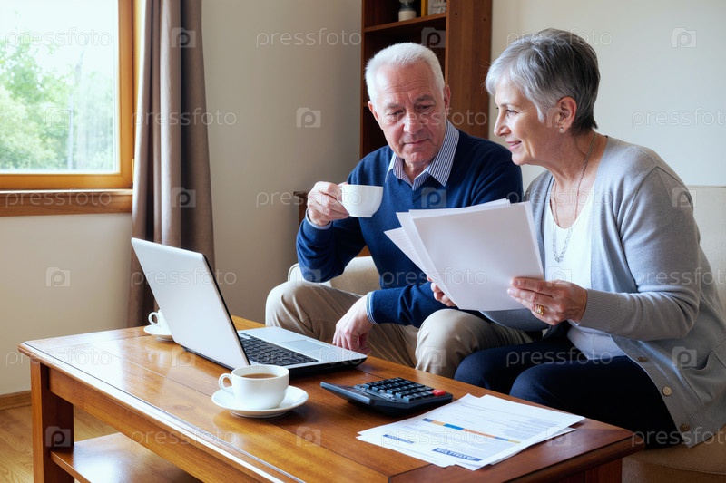 Пожилая пара просматривает счета и составляет бюджет с помощью ноутбука дома