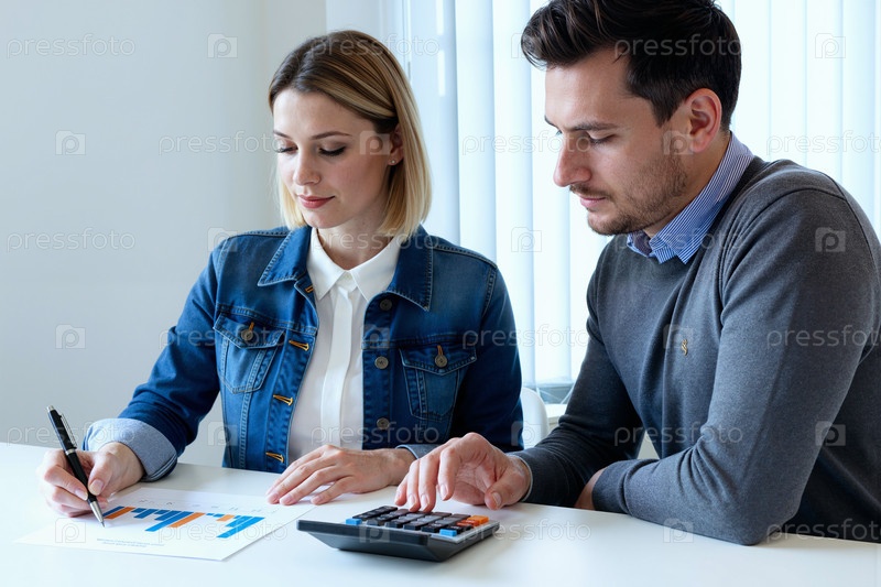 Бизнесмен и женщина просматривают финансовый отчет и вычисляют
