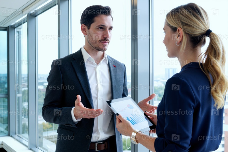 Бизнесмен обсуждает данные продаж с женщиной, использующей планшет в офисе