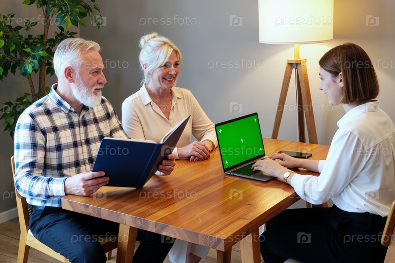Старшая пара просматривает документы с женщиной, использующей ноутбук