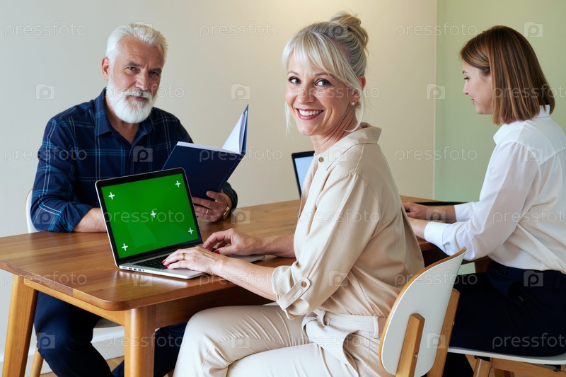 Портрет взрослой женщины, использующей ноутбук на встрече команды