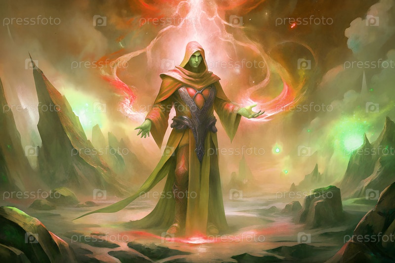 Фантастический маг, бросающий магию огня и льда в темном мистическом пейзаже с светящейся энергией и руинами