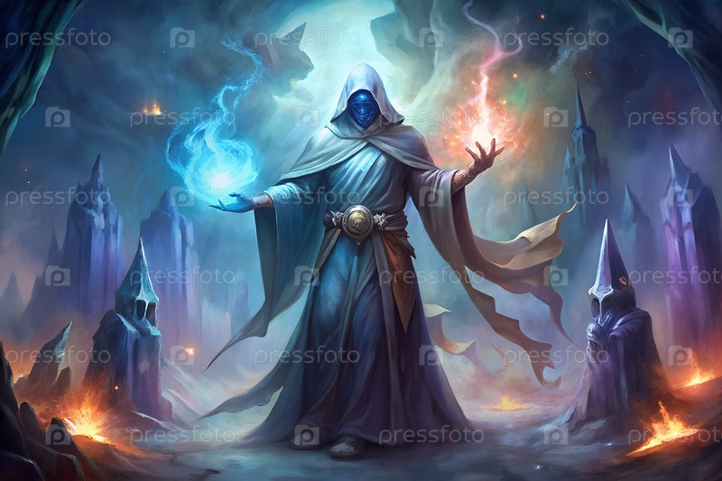 Фантастический маг, бросающий магию огня и льда в темном мистическом пейзаже с светящейся энергией и руинами