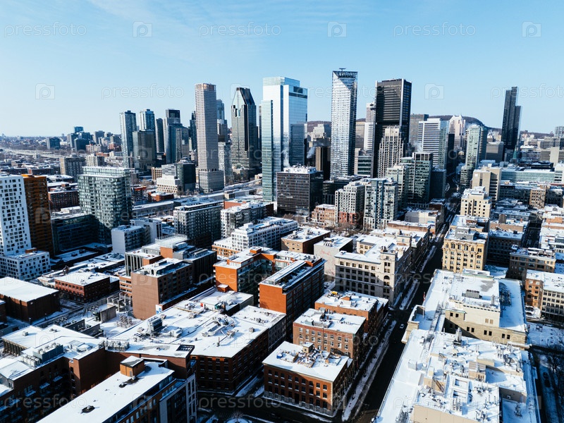 Горизонт центра Монреаля с современными небоскребами и зимним городским пейзажем под чистым голубым небом, Квебек, Канада. g