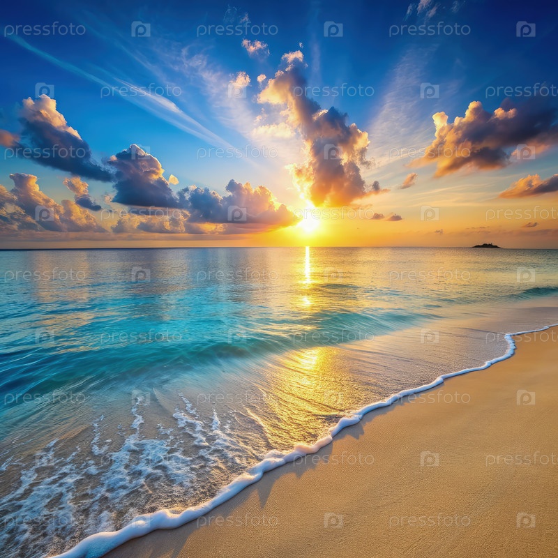 Спокойный утренний восход солнца над тихим океаном и песчаным пляжем