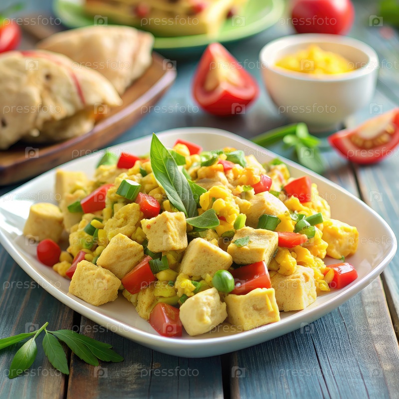 Ямайские укусы акки и тофу с базиликом и перцами на белой тарелке