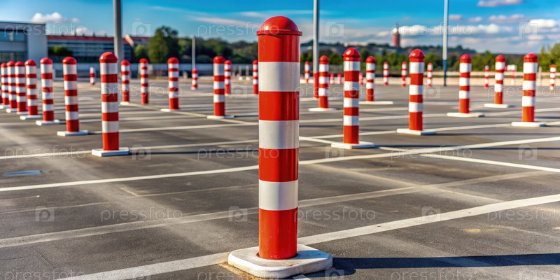 Красно-белые полосатые столбы, обозначающие парковочные места на участке в ясный день