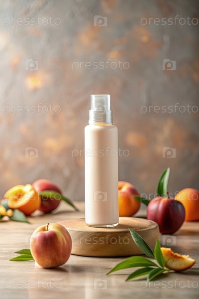 Бутылка крема стоит на деревянном пьедестале, окруженный свежими персиками на уличном столе