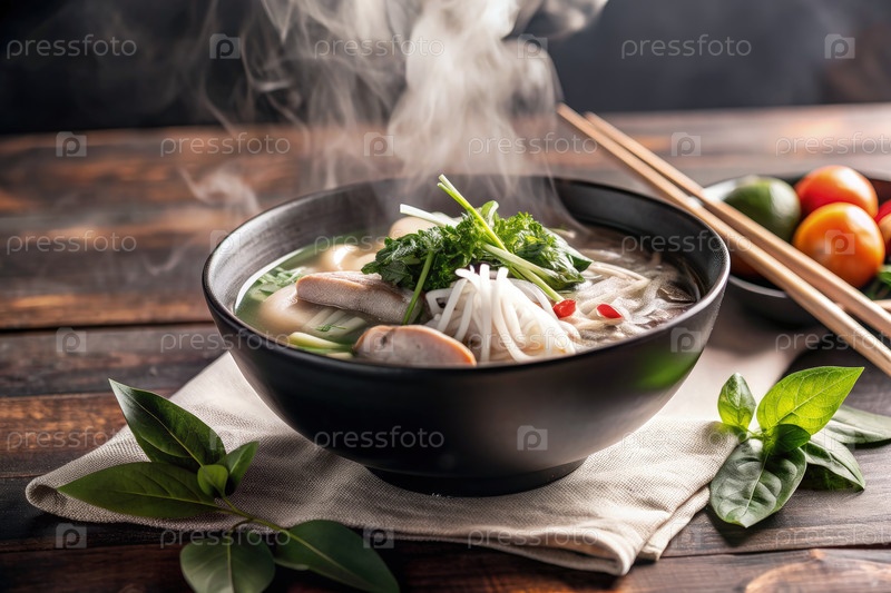 Паровая миска фо с травами и чили-пеппер на деревянном столе. генеративный ИИ