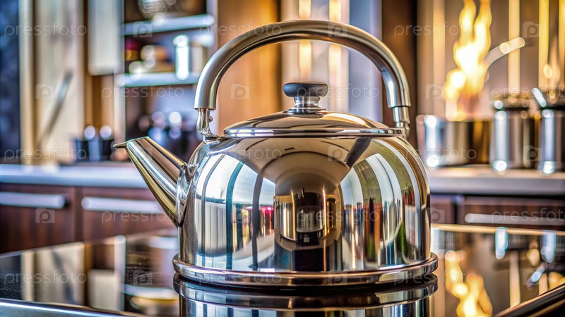 Блестящий хромный чайник кипит на современной плите