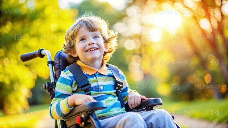 Счастливый ребенок в инвалидной коляске улыбается при закате солнца в парке