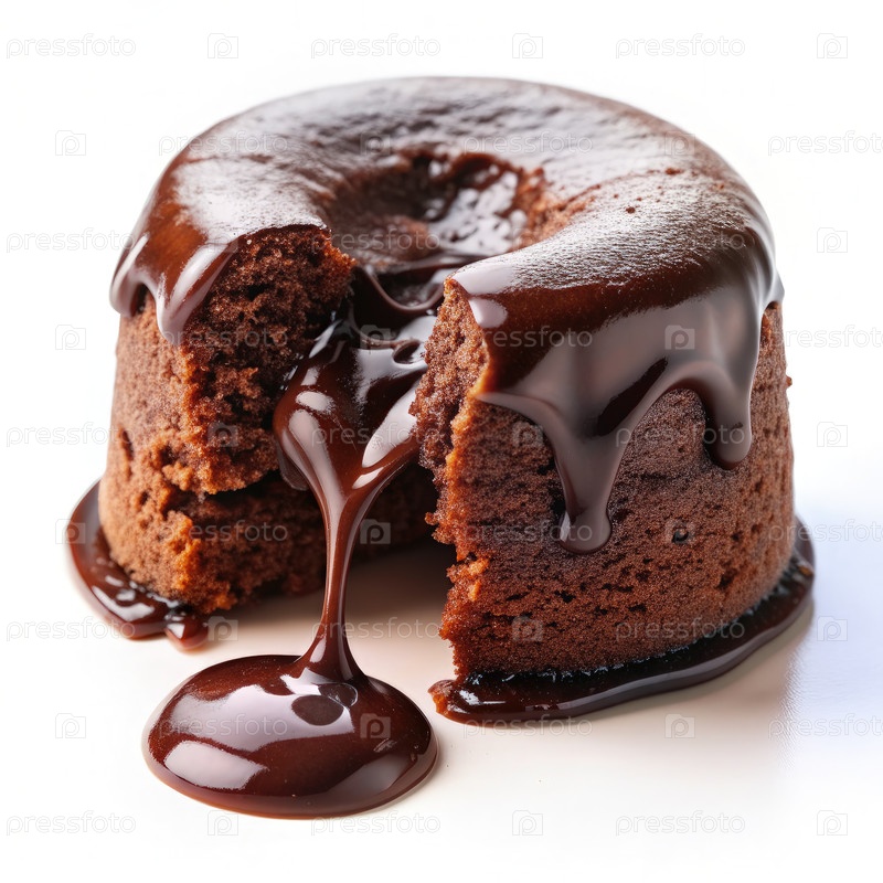 Вкусный укус шоколадного лавового торта, качающегося с теплым и богатым шоколадным соусом на белом фоне