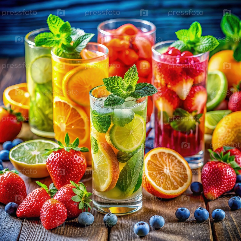 Освежающие летние напитки со свежими фруктами на деревянном столе