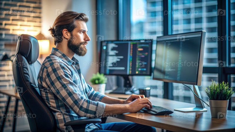 Сосредоточенный веб-разработчик, работающий за столом в современном офисе. генеративная ИИ