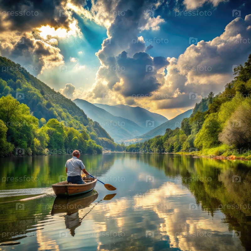 Лодка катается на спокойной грузинской реке под драматическими облаками
