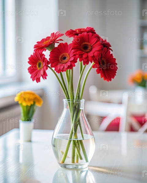 Ярко-красные герберские ромашки в прозрачной вазе на белом столе