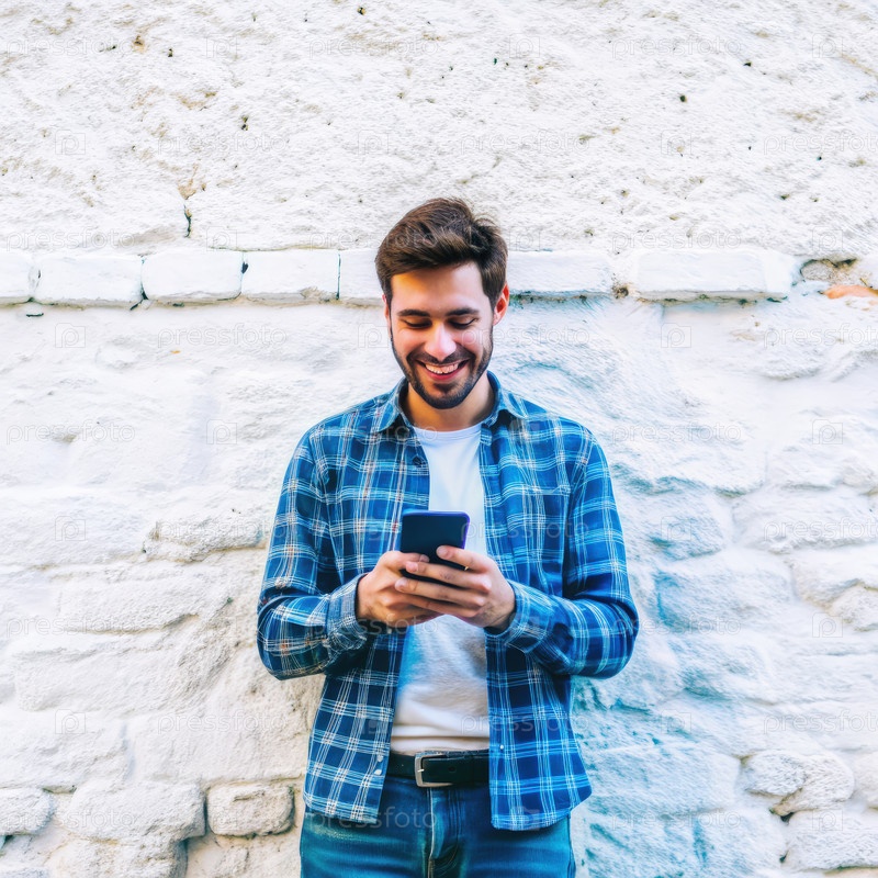 Человек в платовой рубашке улыбается, используя смартфон на белом кирпичном стене
