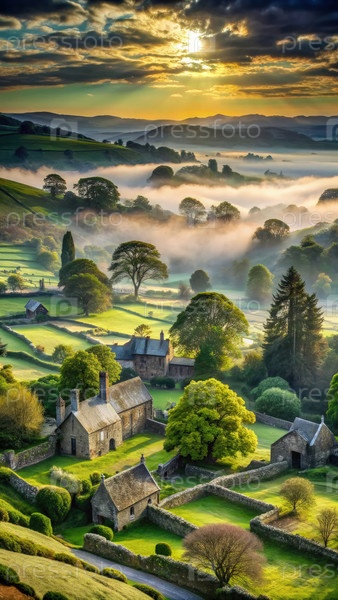 Мистический пейзаж древней Англии на рассвете, демонстрирующий покрытые туманом поля и очаровательные коттеджи среди пышной зелени