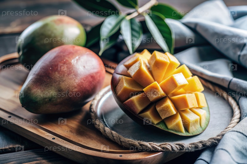 Свежие спелые манго отображаются на деревянной подносе с мягкой синей тканью