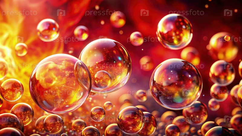Воздушные мыльные пузыри грациозно приземляются на отражающую поверхность с красочным огненным фоном