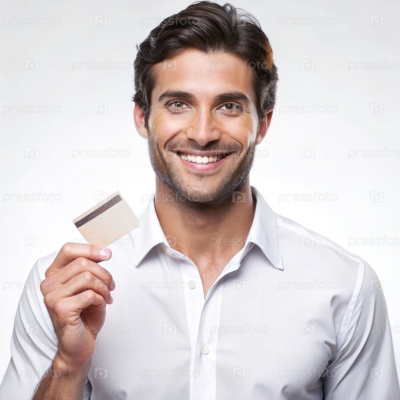 Улыбающийся мужчина, держащий кредитную карту в белой рубашке