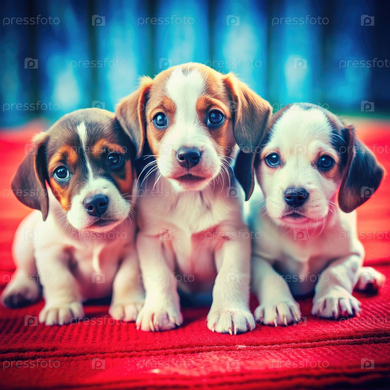 Три игривых щенка, наслаждающиеся солнечным днем вместе на красном одеяле